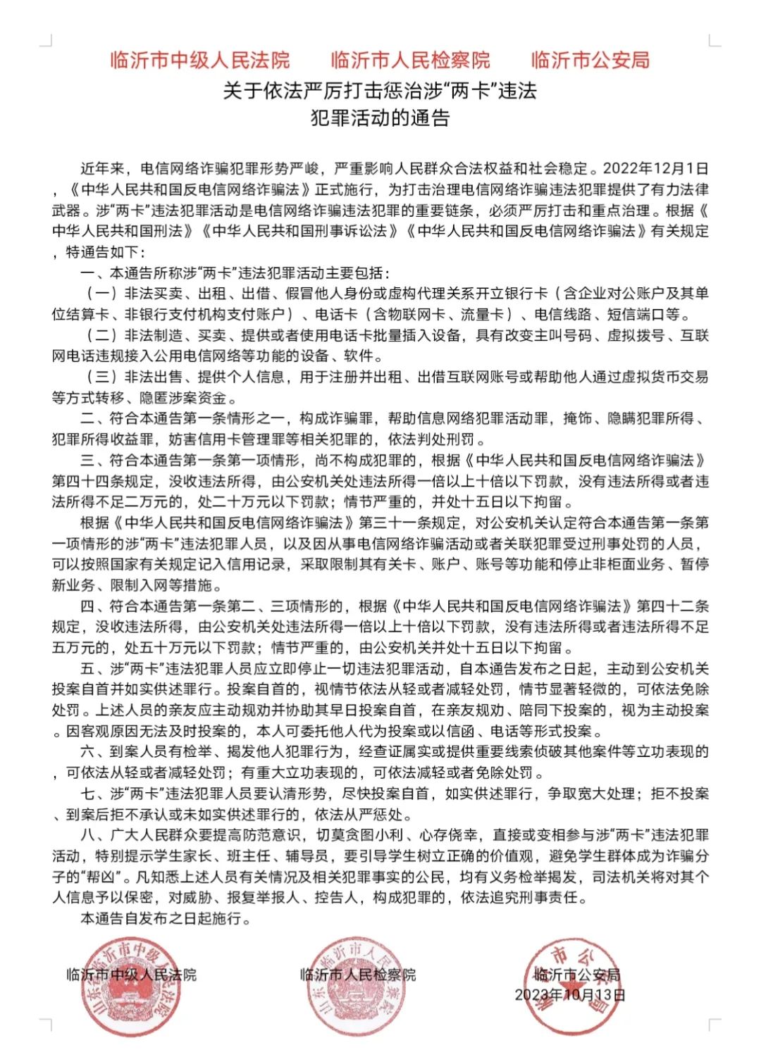 近年来,电信网络诈骗犯罪形势严峻,严重影响人民群众合法权益和社会稳定。2022年12月1日,《中华人民共和国反电信网络诈骗法》正式施行,为打击治理电信网络诈骗违法犯罪提供了有力法律武器。涉“两卡”违法犯罪活动是电信网络诈骗违法犯罪的重要链条,必须严厉打击和重点治理。根据《中华人民共和国刑法》《中华人民共和国刑事诉讼法》《中华人民共和国反电信网络诈骗法》有关规定,特通告如下: